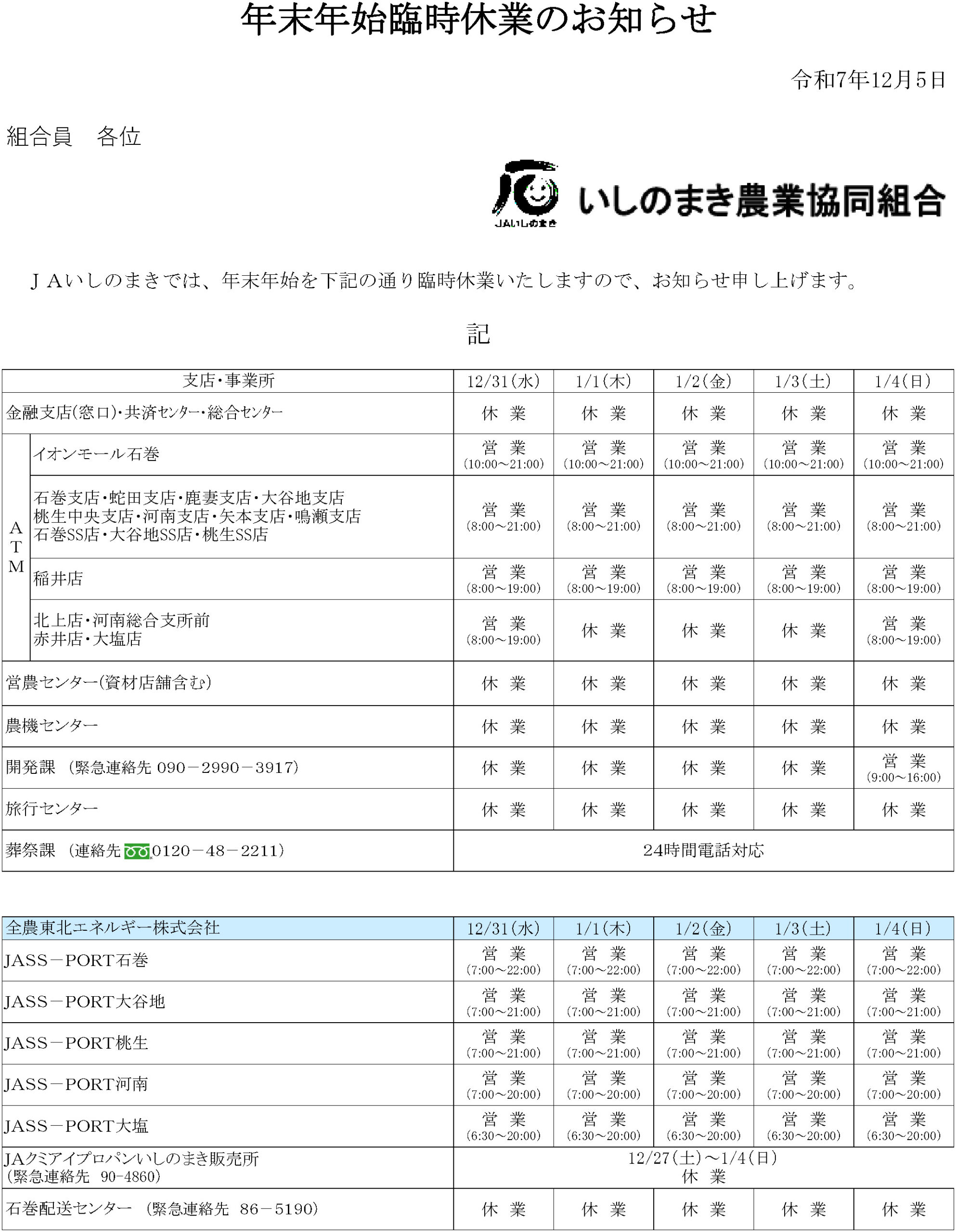 年末年始臨時休業の対応のお知らせ 2025.12.22 JAいしのまきでは年末年始を下記の通り臨時休業いたしますので、お知らせ申し上げます。 詳しくは、こちらのチラシをご覧ください。【PDFファイル】年末年始休業のお知らせ