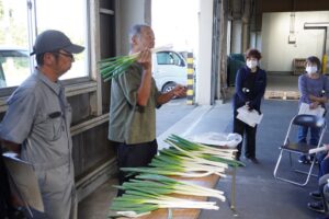JAやもと長葱(ながねぎ)生産組合は9月26日、東松島市のやもと青果物集出荷センターで秋冬ネギの出荷査定会を開きました。