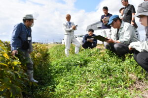 公益社団法人みやぎ農業振興公社とJAいしのまきは10月7日、2026年播種(はしゅ)用大豆の圃場(ほじょう)を3カ所巡回し、生育良好を確認しました。