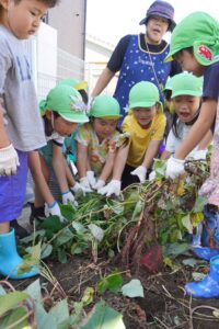 園児らは「うんとこしょ、どっこいしょ」という掛け声とともにつるを引っ張り、サツマイモが傷つかないように慎重にたくさん掘り起こしました。