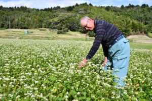 同地区で秋ソバを栽培する㈱つつみは、生産者9人が約14㌶で栽培。同社の浅野勝男代表は「花の下にだんだんと実が付いてきた。収穫が遅くなると香りが落ちてしまうので、時期を見極めて収穫したい」と話します。