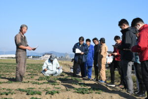 今年は、近年の暑さ対策として播種時期を遅らせましたが、雨が続き、思うように進みませんでした。生育は平年より10日から半月ほど遅れており、寒さが来る前に、中耕や追肥、被覆をするなど対策を確認しました。