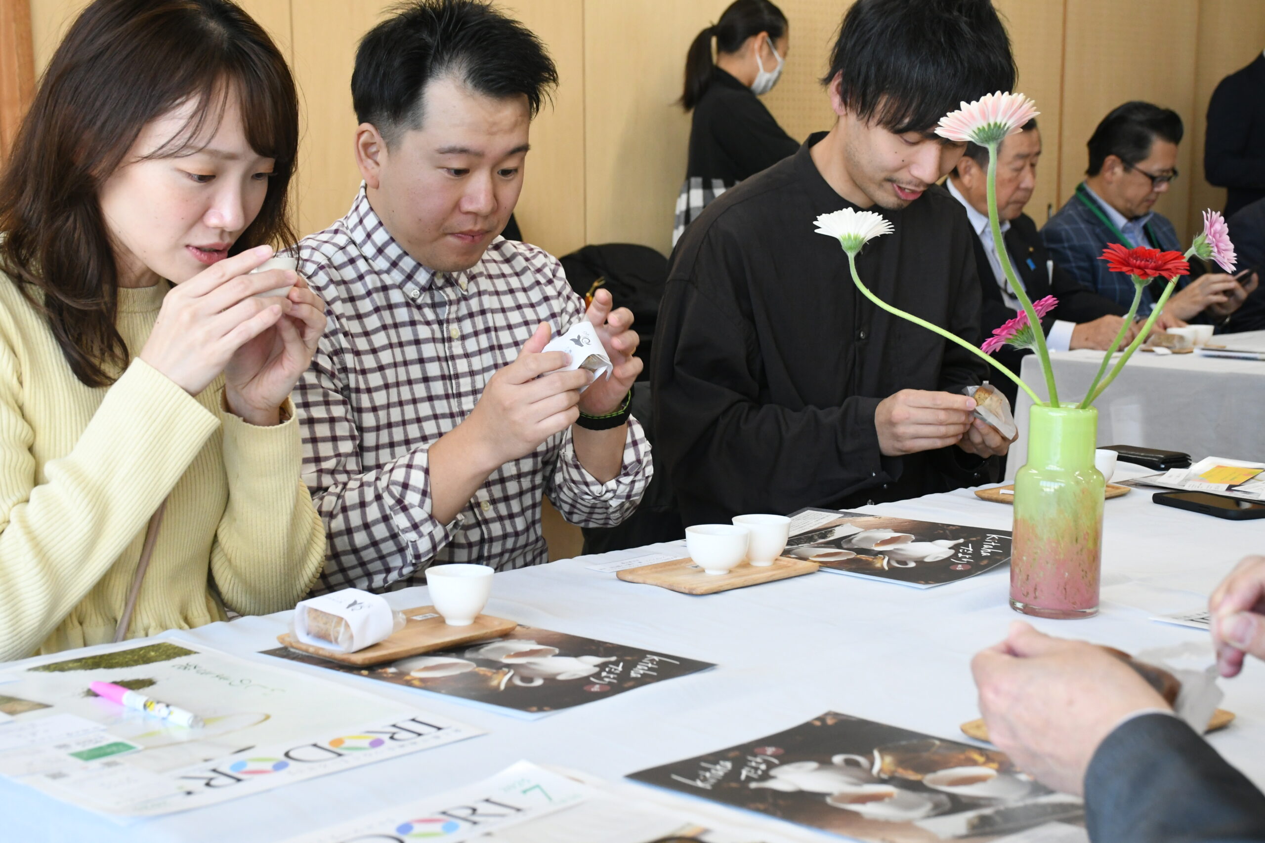 宮城県やkitaha和紅茶を使っている取引先など34人が参加。収穫期前半の6月に摘んだ茶葉を使った「ファーストフラッシュ」と収穫期後半の7月に摘んだ「セカンドフラッシュ」の和紅茶と焼き菓子を提供しました。