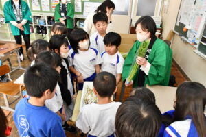 児童らは、高橋さんが持参した種セリを見せると、「初めて見た」「思ったより小さい」と笑顔で話しました。