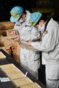 JAは11月25日、東松島市大塩の大塩倉庫で2025年産大豆の初検査を行いました。