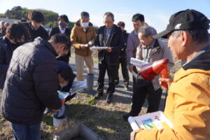 福島県のJA福島さくらたむら地区稲作部会と水稲連絡協議会は12月11日、石巻市河南地区の農事組合法人たてファーム・和(なごみ)を訪れ、乾田直播栽培の取り組みを視察しました。