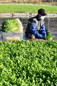 JAいしのまきセリ部会が栽培する伝統野菜「河北せり」が収穫最盛期を迎えています。 今年は部会員13人が2・1㌶で栽培。出荷25㌧を目指し、収穫は2月ごろまで続きます。