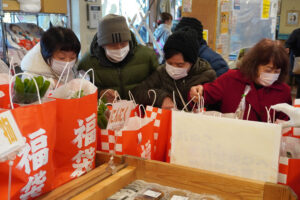 店内には新鮮な旬の野菜や手作りの総菜、JAオリジナル商品がたくさん並び、来店者先着100人に粗品をプレゼントしました。福袋を購入した来店者は「昨年買った時に、新鮮野菜がたくさん入っていた。今年も手に入れられてよかった」と笑顔で話しました。
